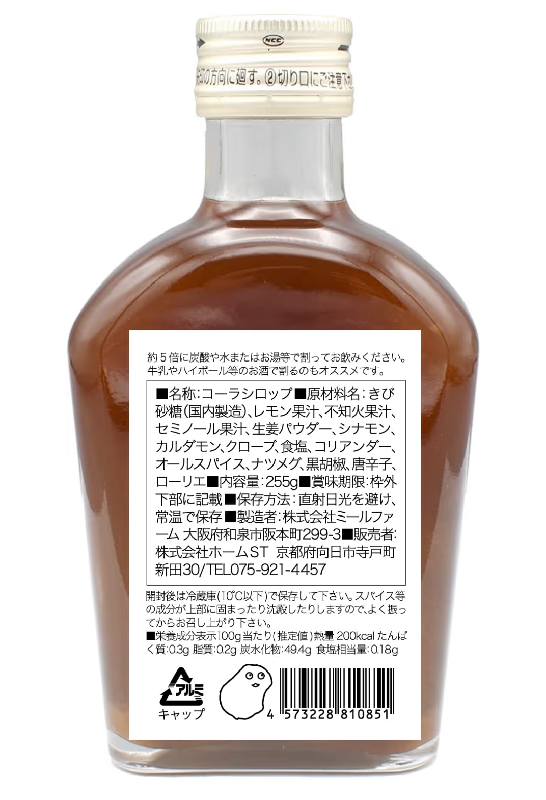 きび砂糖に生姜・オールスパイス・シナモンパウダー・ナツメグパウダーをはじめとした10種類のスパイスに、レモン・不知火の果汁をふんだんに使用、添加物や保存料を一切使用せず作り上げられた、自然で体にやさしいコーラ風味のシロップです。
